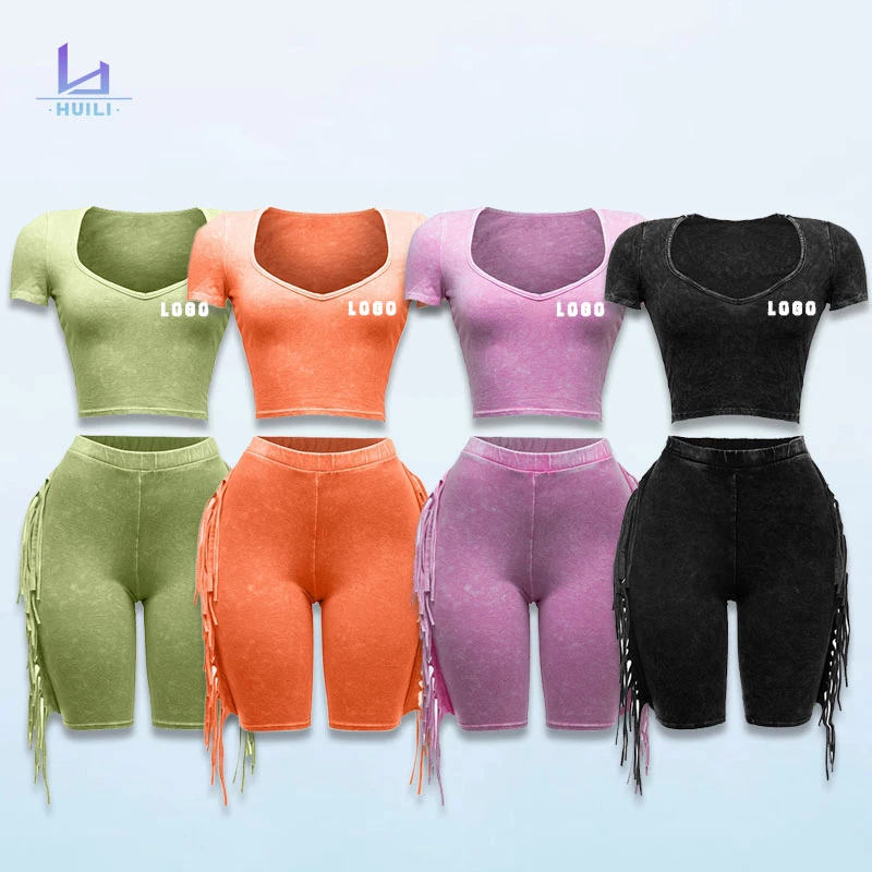 Huili Manufacturer Oem 2025 Two Piece Vintage Washed Crop Top t Shirt & Shorts Summer Set Loungewear Women's Sets Custom logo
